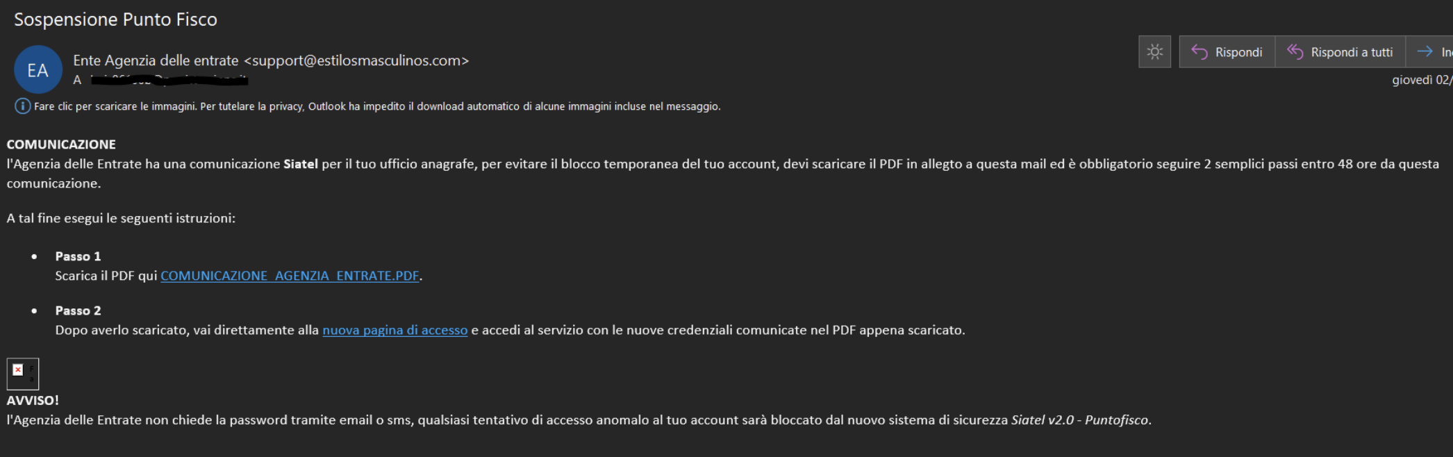 L’utente riceve una e-mail, proveniente da un indirizzo e-mail chiaramente non istituzionale, una comunicazione riportante l’oggetto “Sospensione Punto Fisco”, nella quale viene informato che per evitare il blocco temporaneo dell’account dovrebbe scaricare un PDF e poi accedere con le credenziali da un secondo link che dovrebbe indirizzare alla schermata di login di PuntoFisco, ma in realtà indirizza l’utente ad una pagina web contraffatta con i loghi dell’Agenzia.